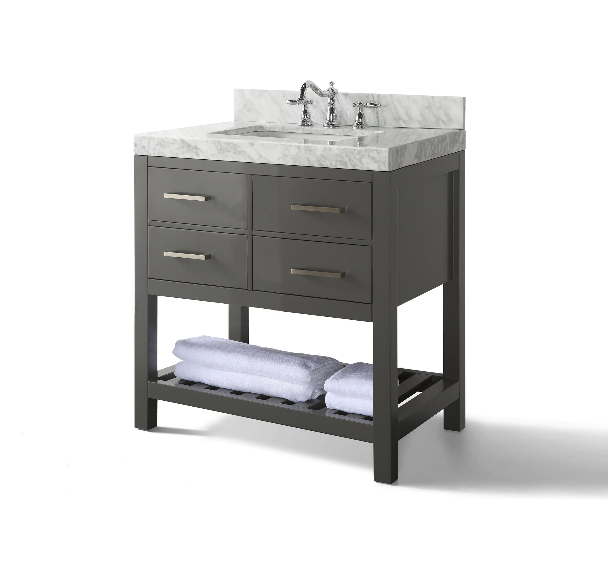 The Elizabeth Collection is a pure transitional design that brings balance and harmony to any space. From selecting quality wood to using the most durable soft-close hardware, no details were overlooked in crafting the Elizabeth 36 inch vanity set. The vanity set includes a furniture-style cabinet, a thick imported Italian Carrara White marble top with a 4-inch backsplash, wide rectangular under-mount basin, solid wood dovetailed drawer boxes, soft-close drawers, and brushed nickel hardware. Complete the look with our mirrors which are sold separately (M-28-SG).