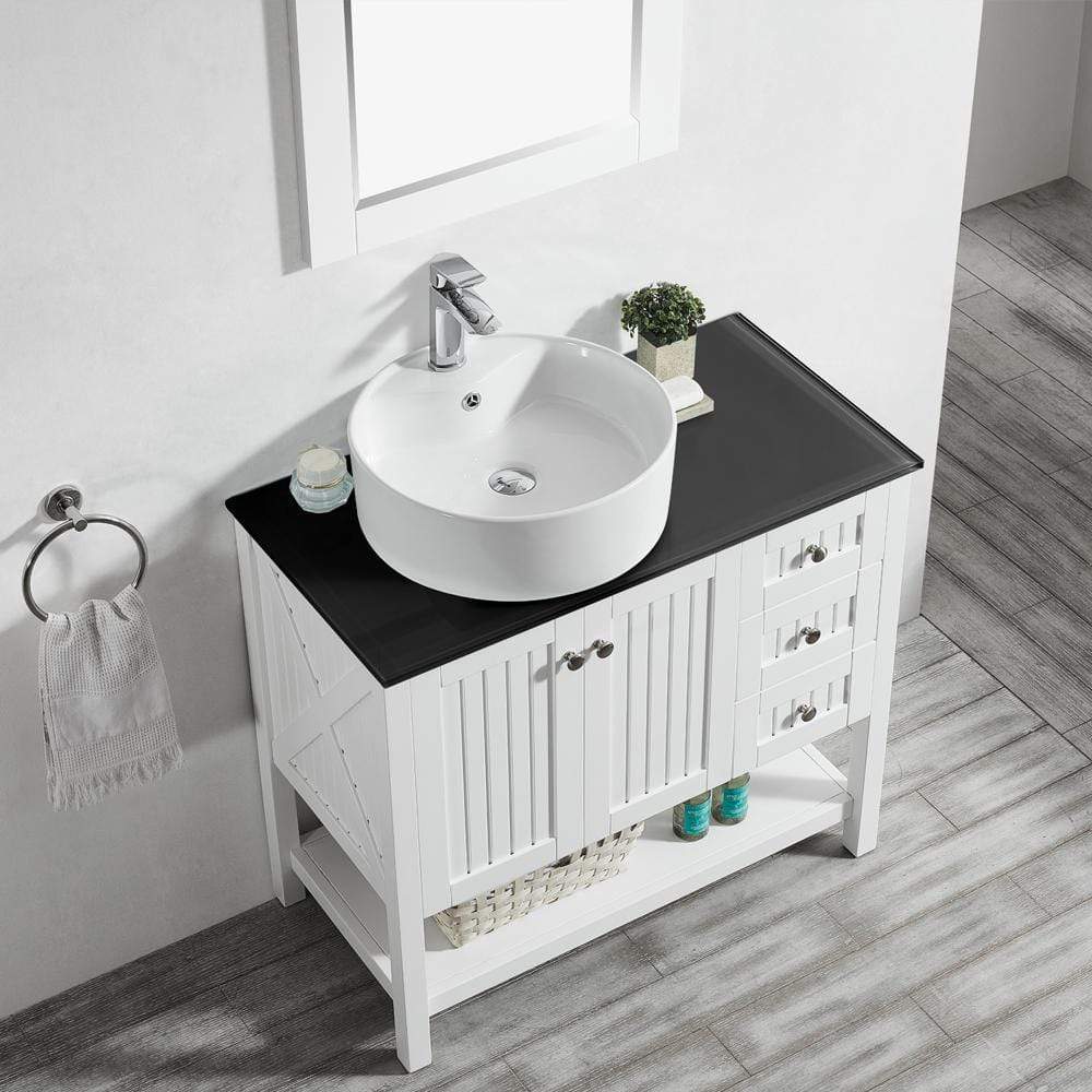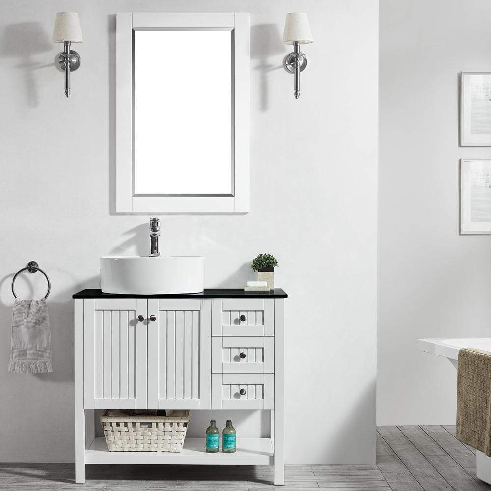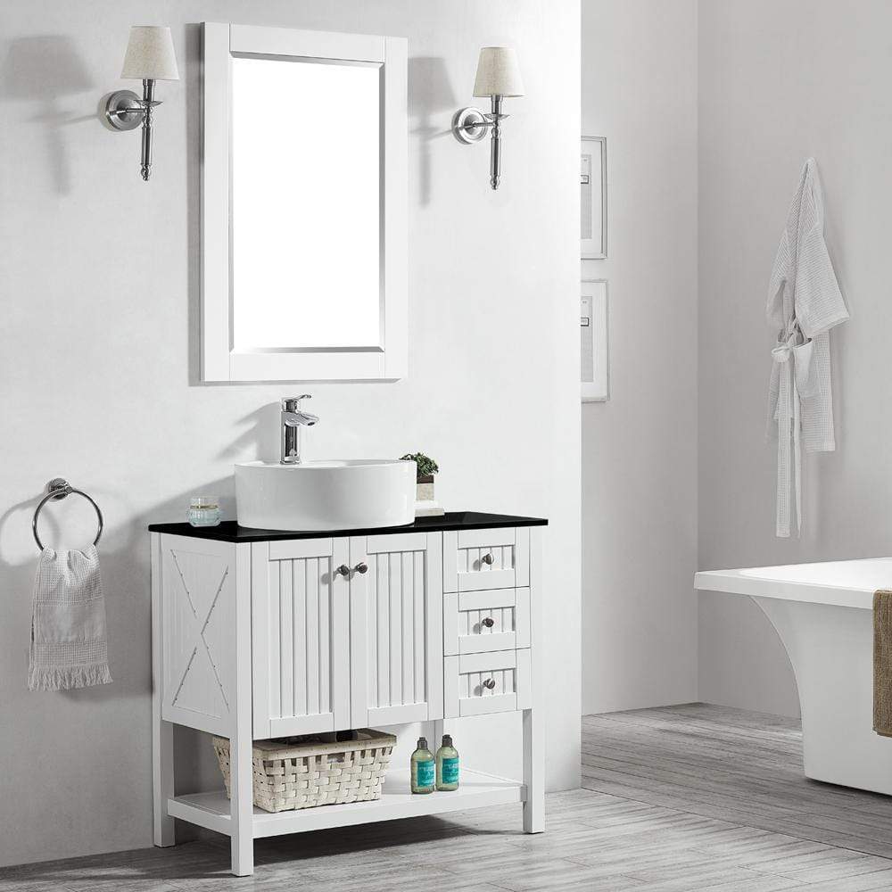 Vinnova Modena 36” Vanity in White with Glass Countertop with White Vessel Sink With Mirror 756036-WH-BG