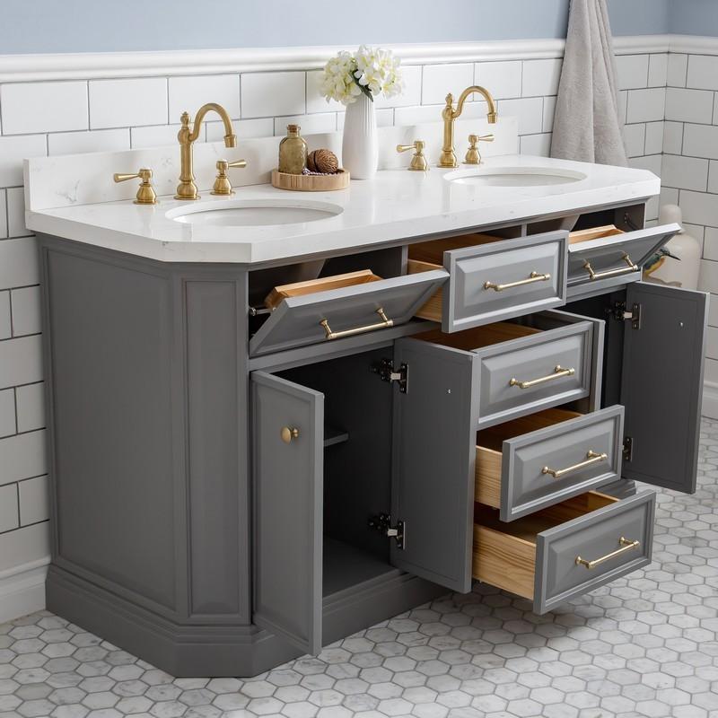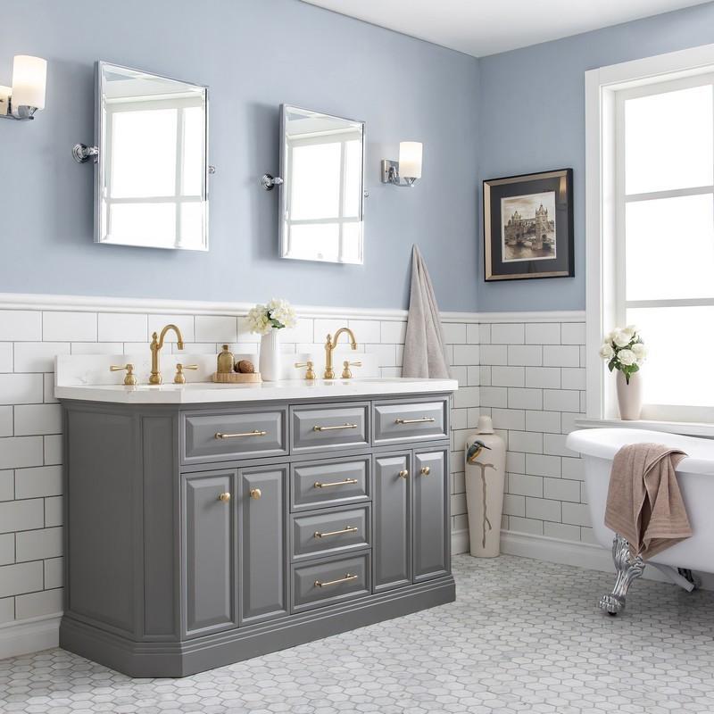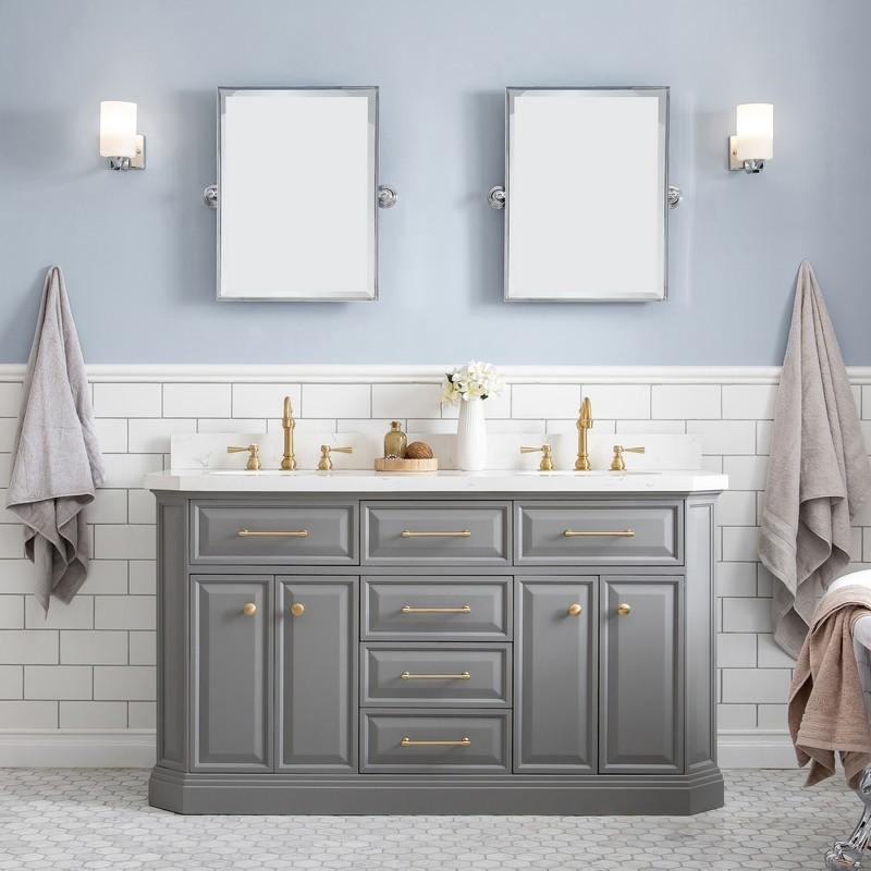 Water Creation PA60C-0612CG Palace 60 Inch Quartz Carrara Cashmere Grey Bathroom Vanity Set and Faucets in Satin Brass and Mirrors only in Chrome