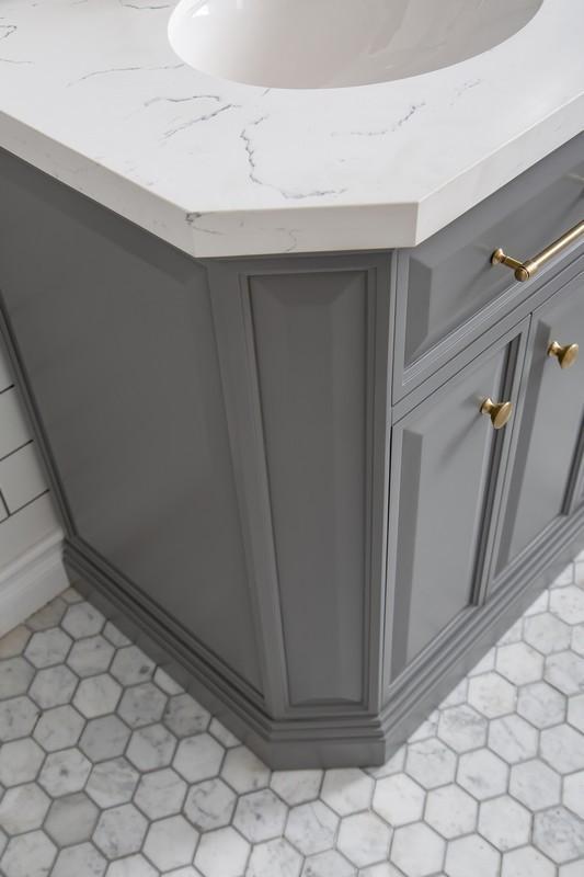 DIMENSIONS AND MEASUREMENTSTheme Traditional / Classic Number of Sinks Single Finish Greys Type Free-Standing Countertop Material Quartz Features Base Cabinet / Faucet / Mirror Collection Palace UPC '732030757387 Width 60 Depth 22 Height 34 Features: