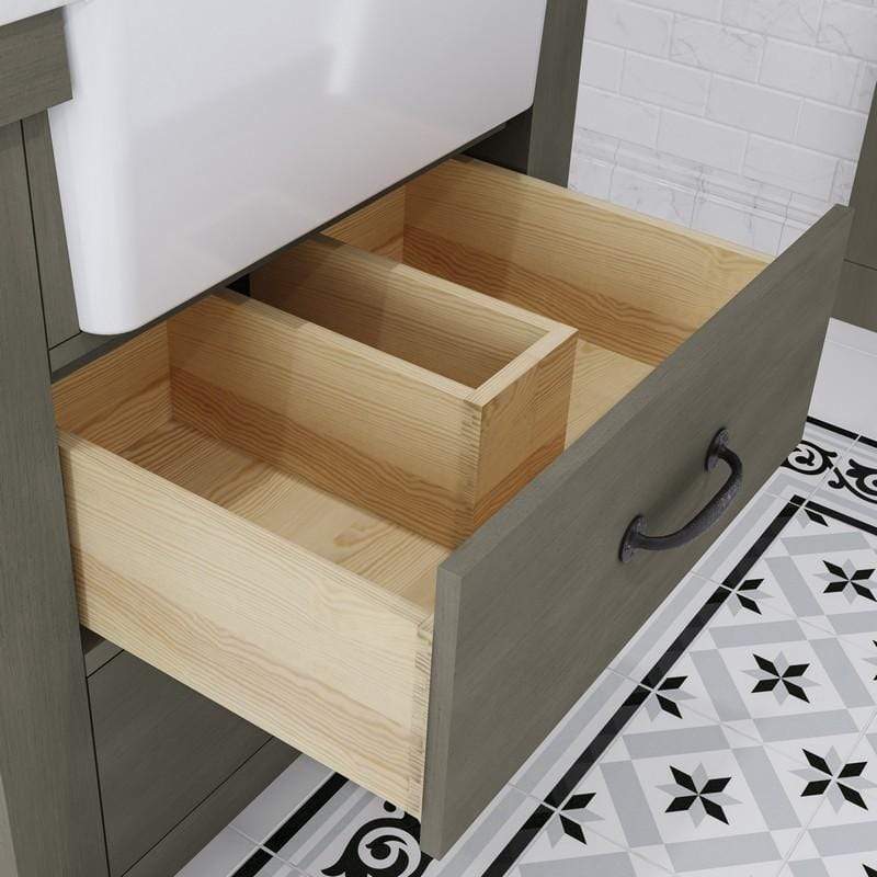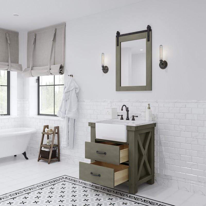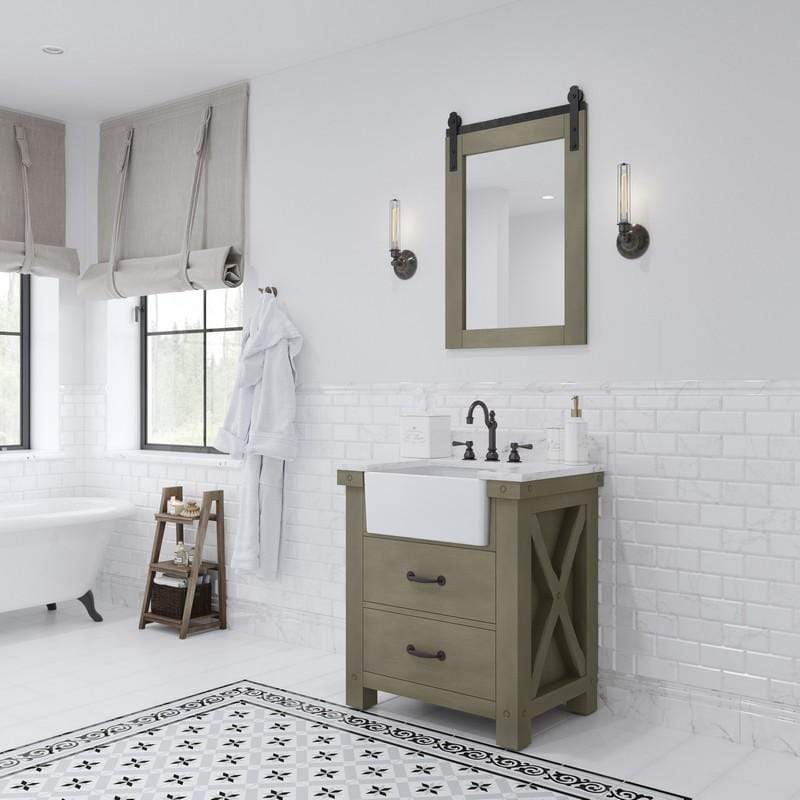 Ready yourself for a brand-new day in the versatility with the barn style of the Paisley vanity collection. Inspired by nature, a stellar color selection that includes grizzle gray or rustic sienna will satisfy your unique stylishness. Incorporated with superior craftsmanship, the X-Panels on both sides of the vanity are the epitome of modern farmhouse schemes. Its eye-catching style along with rustic aesthetic includes a spacious cabinet blended with antique wrought iron handles. The expertly crafted soft-closing drawers offer plenty of storage space for your bathroom essentials. A large ceramic apron sink bowl in snow white catches the center of attention, seamlessly complementing the soft glow of the vanity along with the Carrara White marble countertop. Paisley vanity collection is an excellent choice that combines the elegance of the past with a design that meets today's needs.