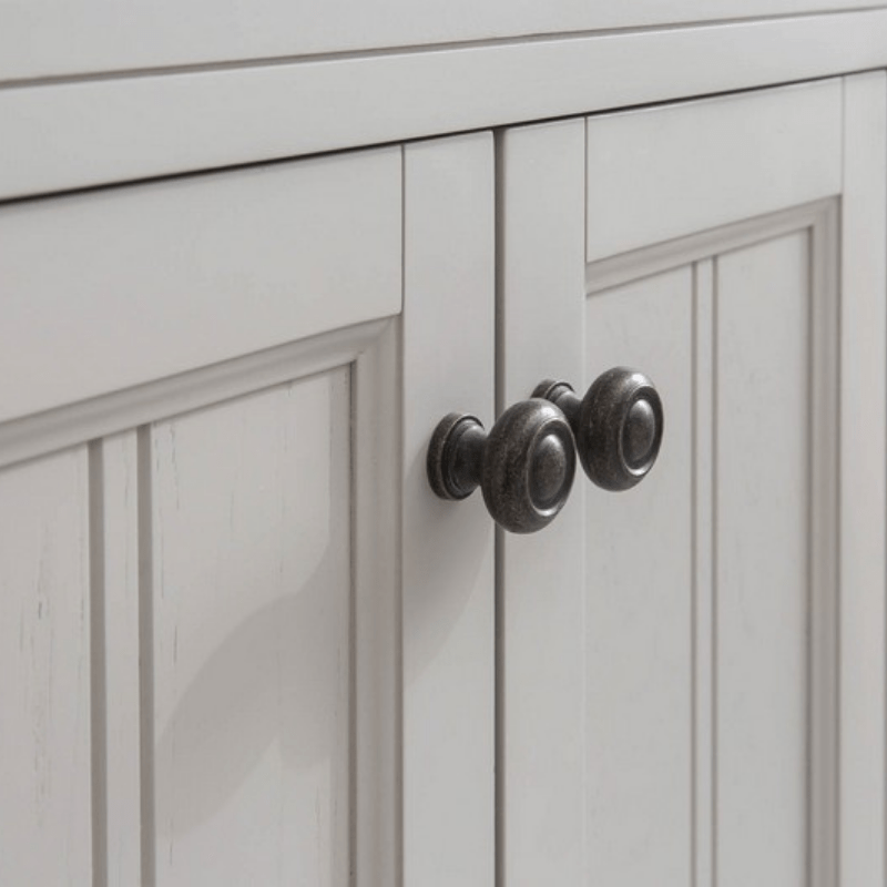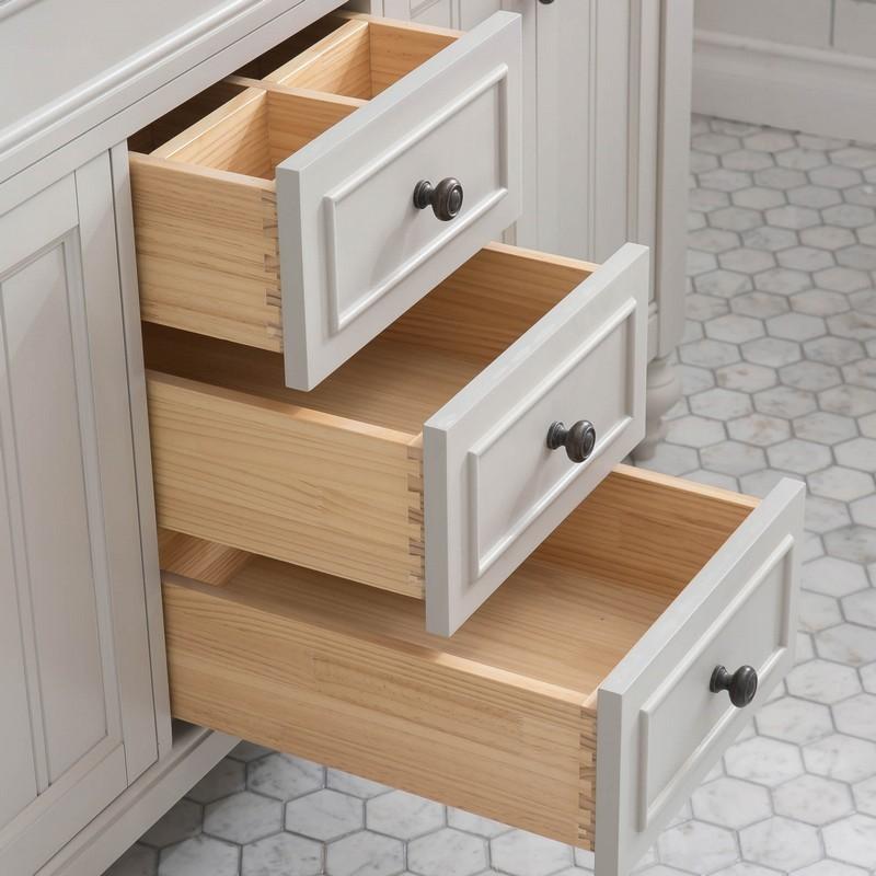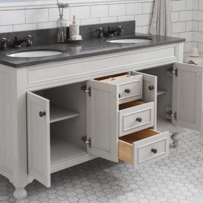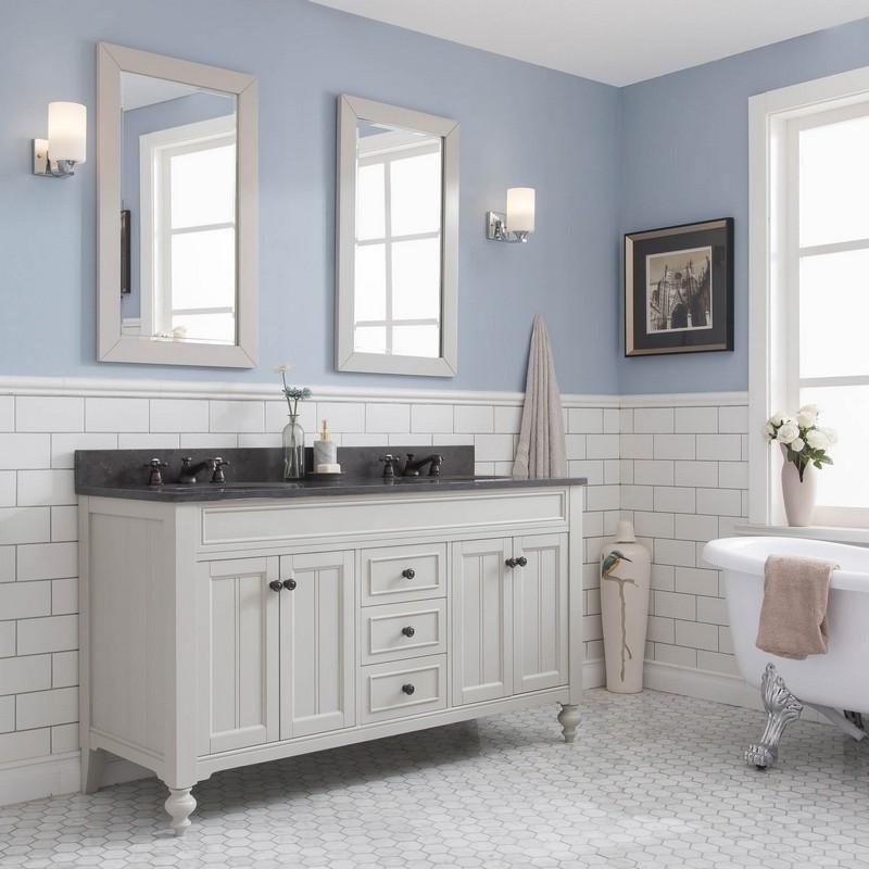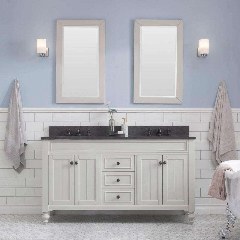 Potenza collection bathroom vanity with blue limestone top definitely turns on the upscale rustic and contemporary charm. Crafted for form and function, this 60†solid wood Vanity includes a trio of soft-closing drawers. With its elegant and timeless design, double-door with parallel lines element reveals ample storage for towels, toiletries, and more. Richly traditional elements such as wood grain, elegant round legs, and earl grey finish grant this bathroom vanity with integrated sink such division. Incorporating a beveled countertop edge for the vitreous ceramic sink, the craftsmanship and details are impressive. Combined with this beautiful deck-mounted roman lavatory faucet (oil-bronze accent) and beveled glass rectangular mirror, we express an upgrade for refreshing bathroom