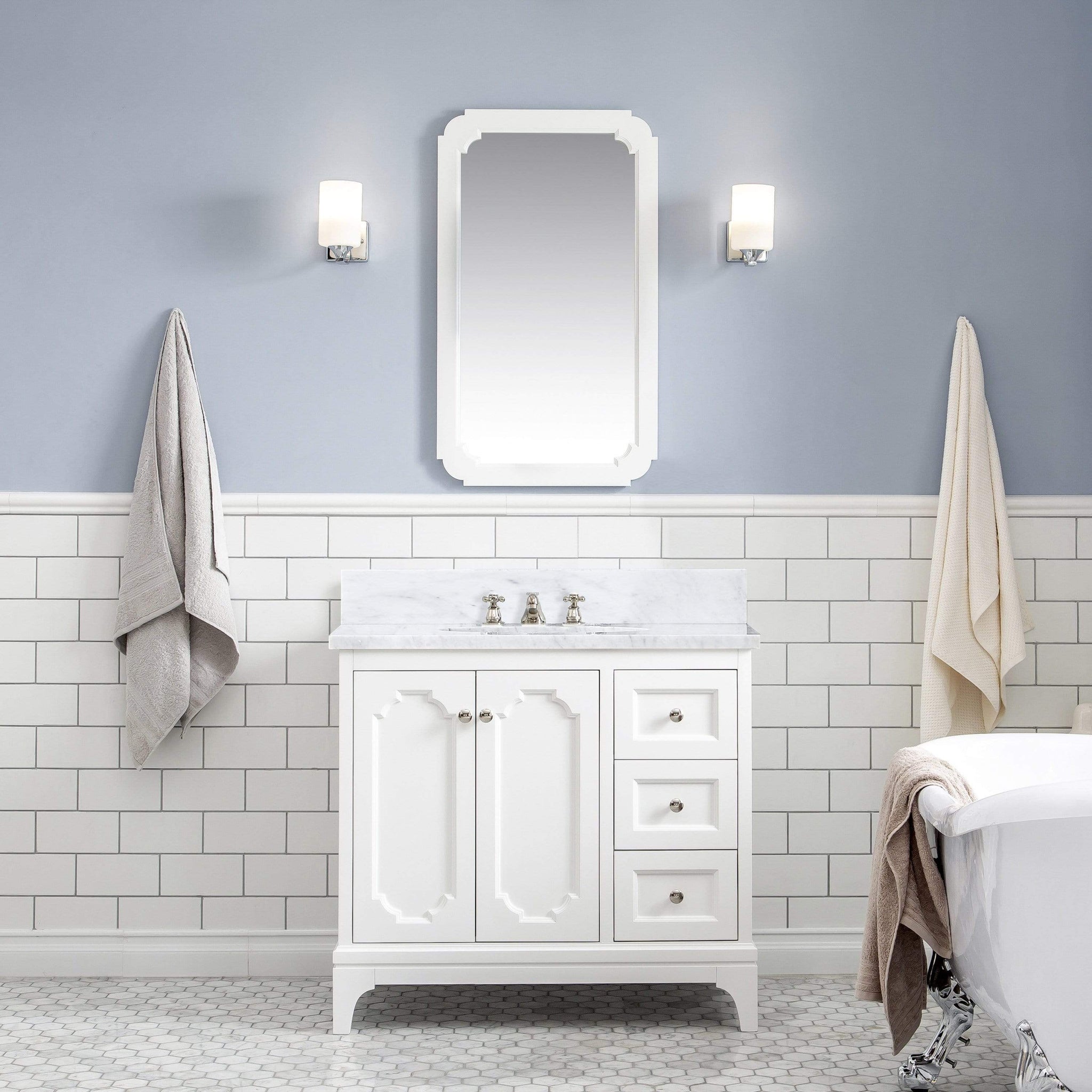 Water-Creation QU36CW05PW-000BX0905 Queen 36 Inch Single Sink Carrara White Marble Countertop Vanity in Pure White with Classic Faucet