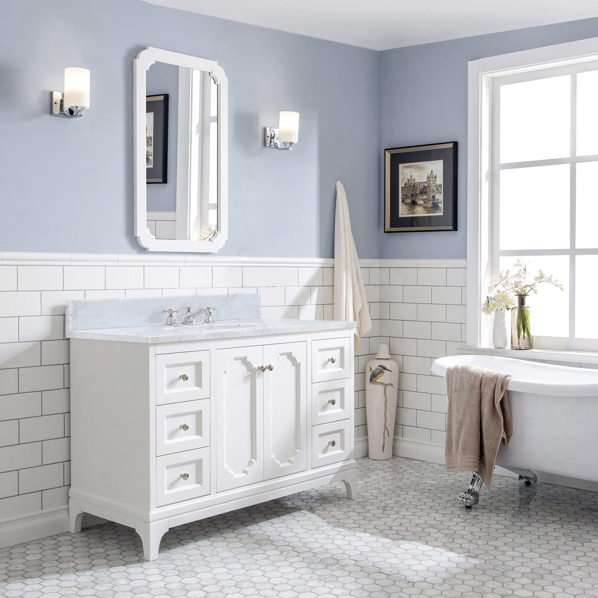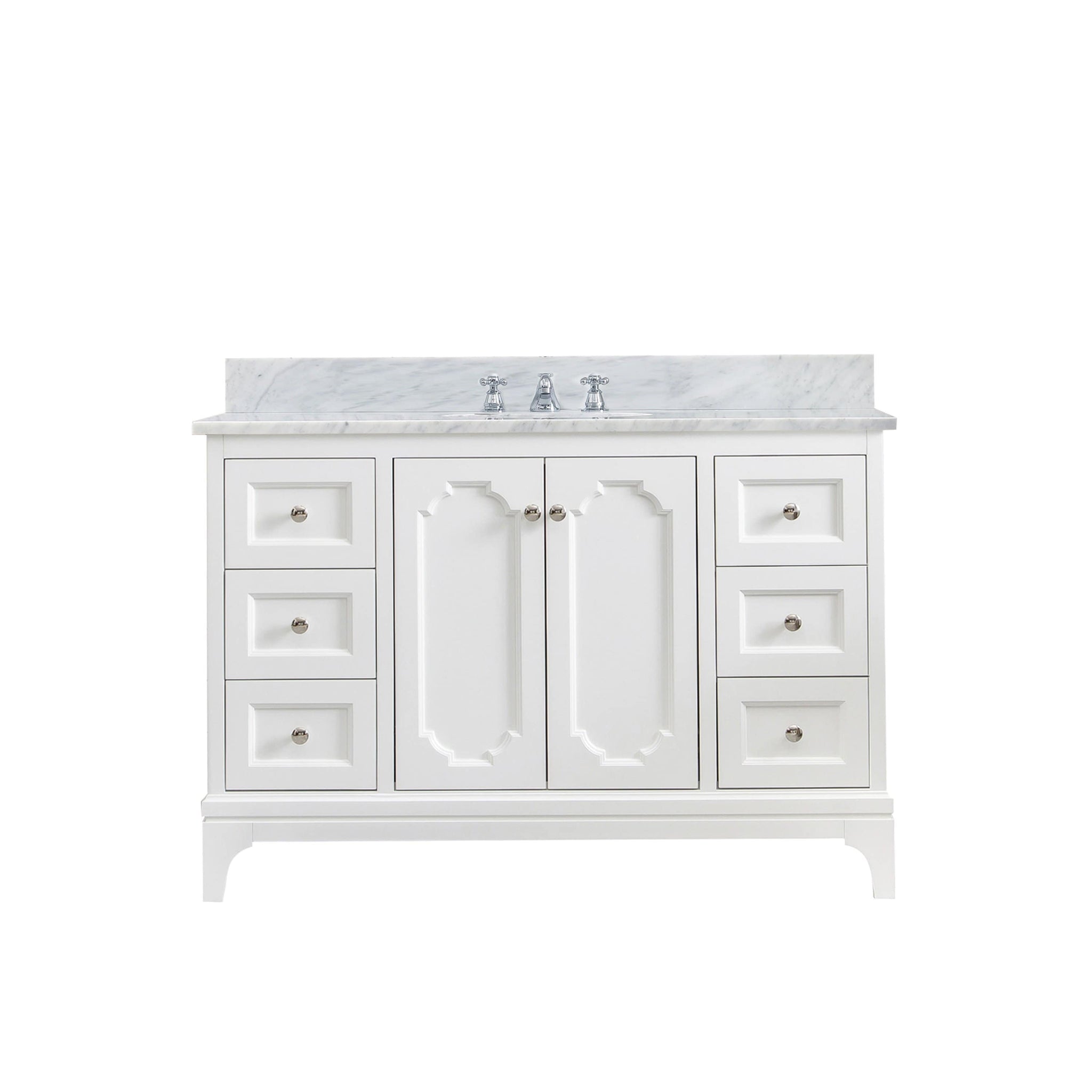 Water-Creation QU48CW05PW-000BX0905 Queen 48 Inch Single Sink Carrara White Marble Countertop Vanity in Pure White with Classic Faucet
