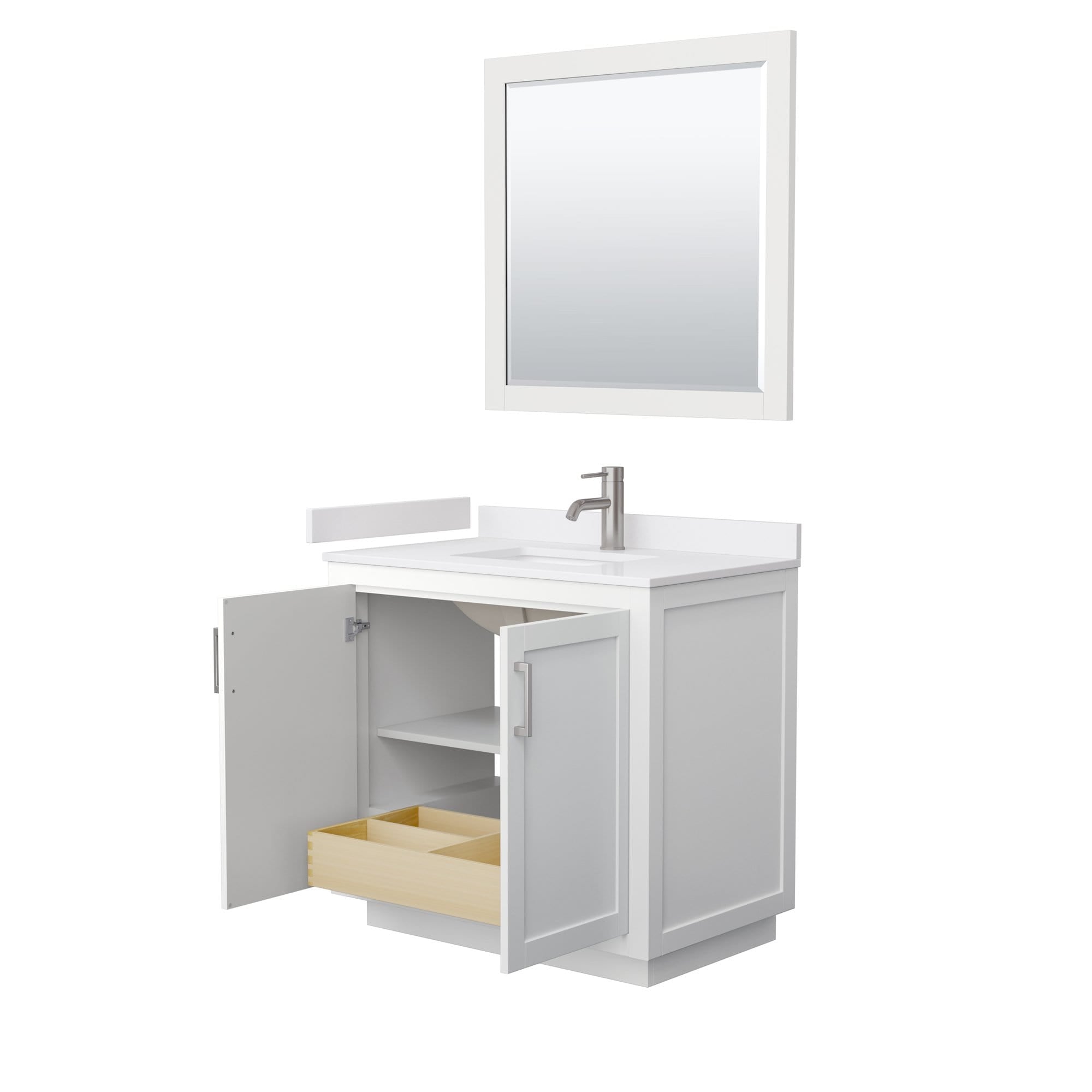 Wyndham Collection WCF292936SWHWCUNSM34 Miranda 36 Inch Single Bathroom Vanity in White, White Cultured Marble Countertop, Undermount Square Sink, Brushed Nickel Trim, 34 Inch Mirror