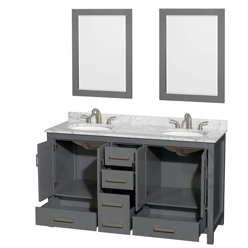Wyndham Collection WCS141460DKGCMUNOM24 Sheffield 60 Inch Double Bathroom Vanity in Dark Gray, White Carrara Marble Countertop, Undermount Oval Sinks, and 24 Inch Mirrors