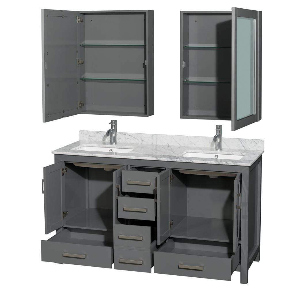 Wyndham Collection WCS141460DKGCMUNSMED Sheffield 60 Inch Double Bathroom Vanity in Dark Gray, White Carrara Marble Countertop, Undermount Square Sinks, and Medicine Cabinets