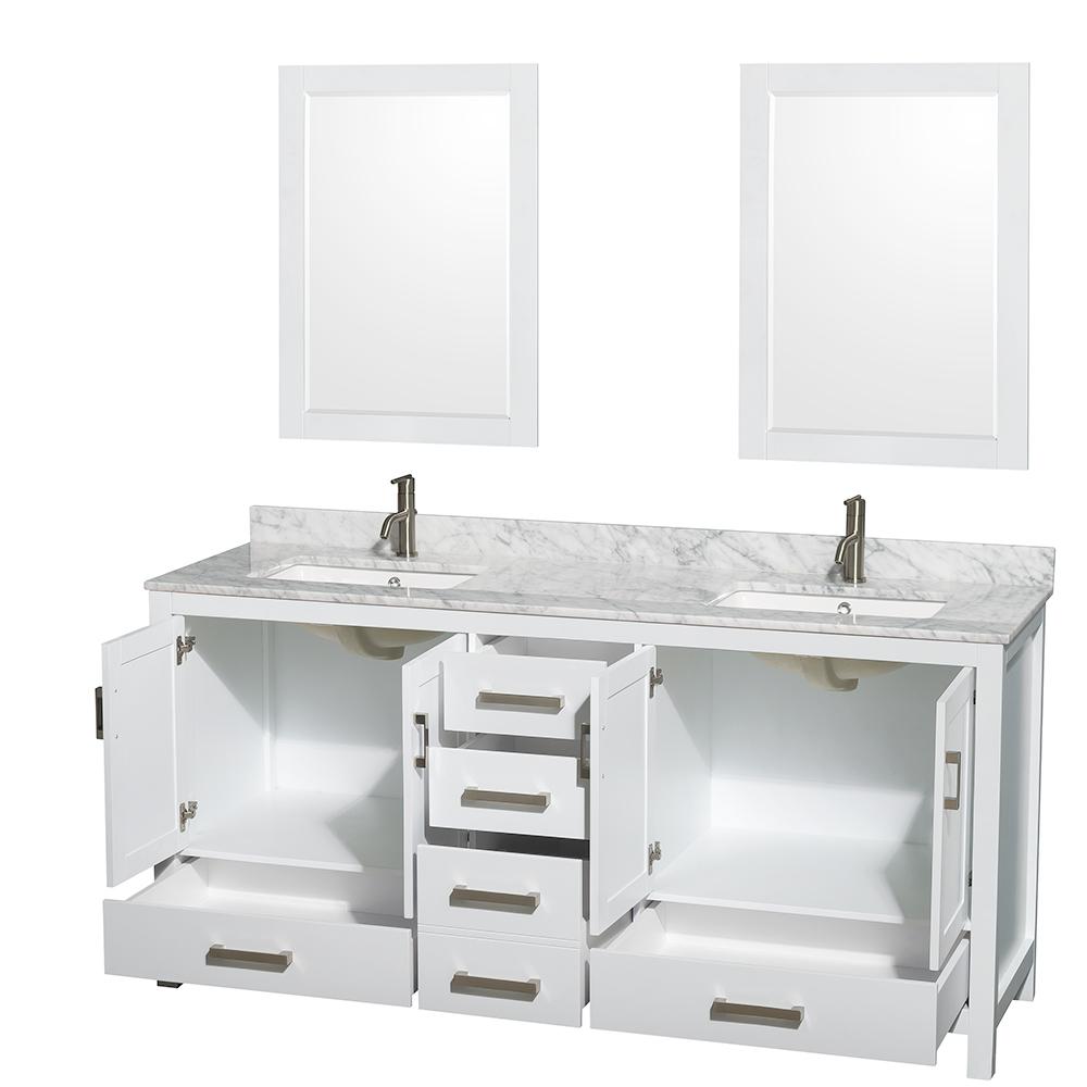 Wyndham Collection WCS141472DWHCMUNSM24 Sheffield 72 Inch Double Bathroom Vanity in White, White Carrara Marble Countertop, Undermount Square Sinks, and 24 Inch Mirrors
