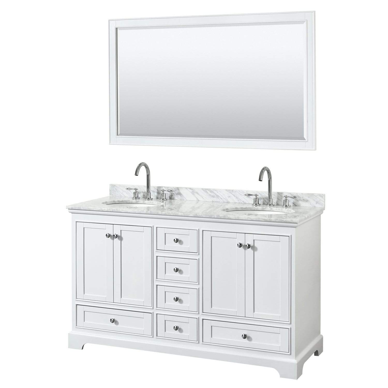 Wyndham Collection WCS202060DWHCMUNOM58 Deborah 60 Inch Double Bathroom Vanity in White, White Carrara Marble Countertop, Undermount Oval Sinks, and 58 Inch Mirror