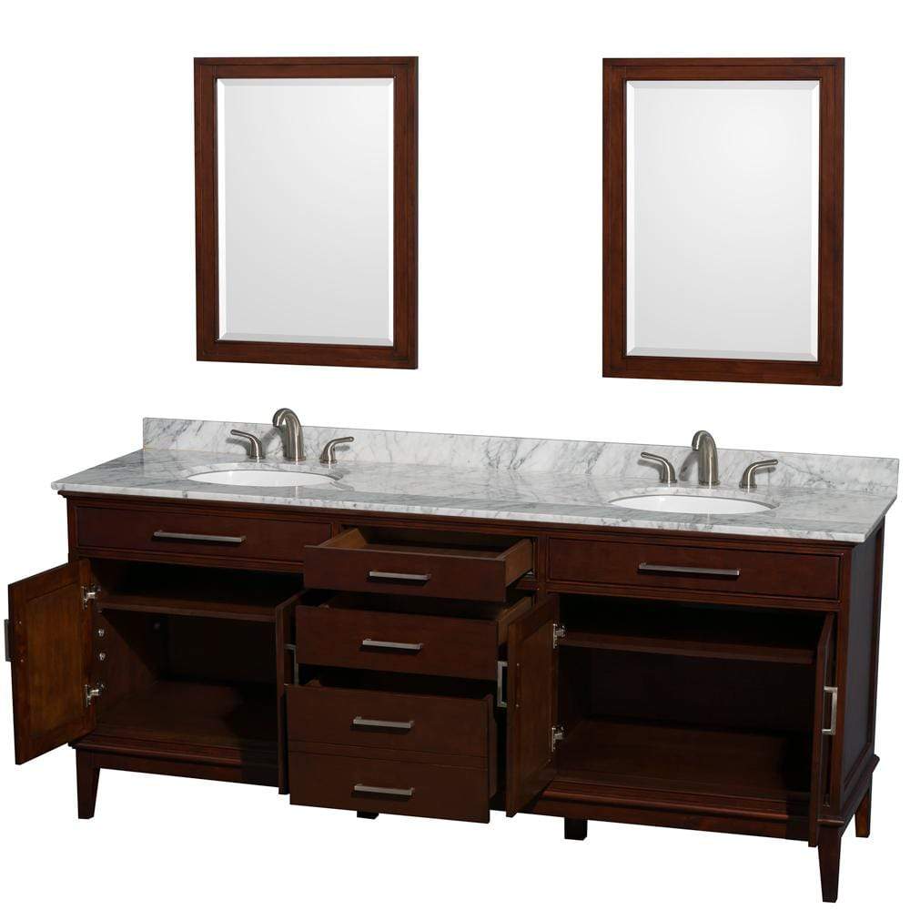 Wyndham Collection WCV161680DCDCMUNRM24 Hatton 80 Inch Double Bathroom Vanity in Dark Chestnut, White Carrara Marble Countertop, Undermount Oval Sinks, and 24 Inch Mirrors