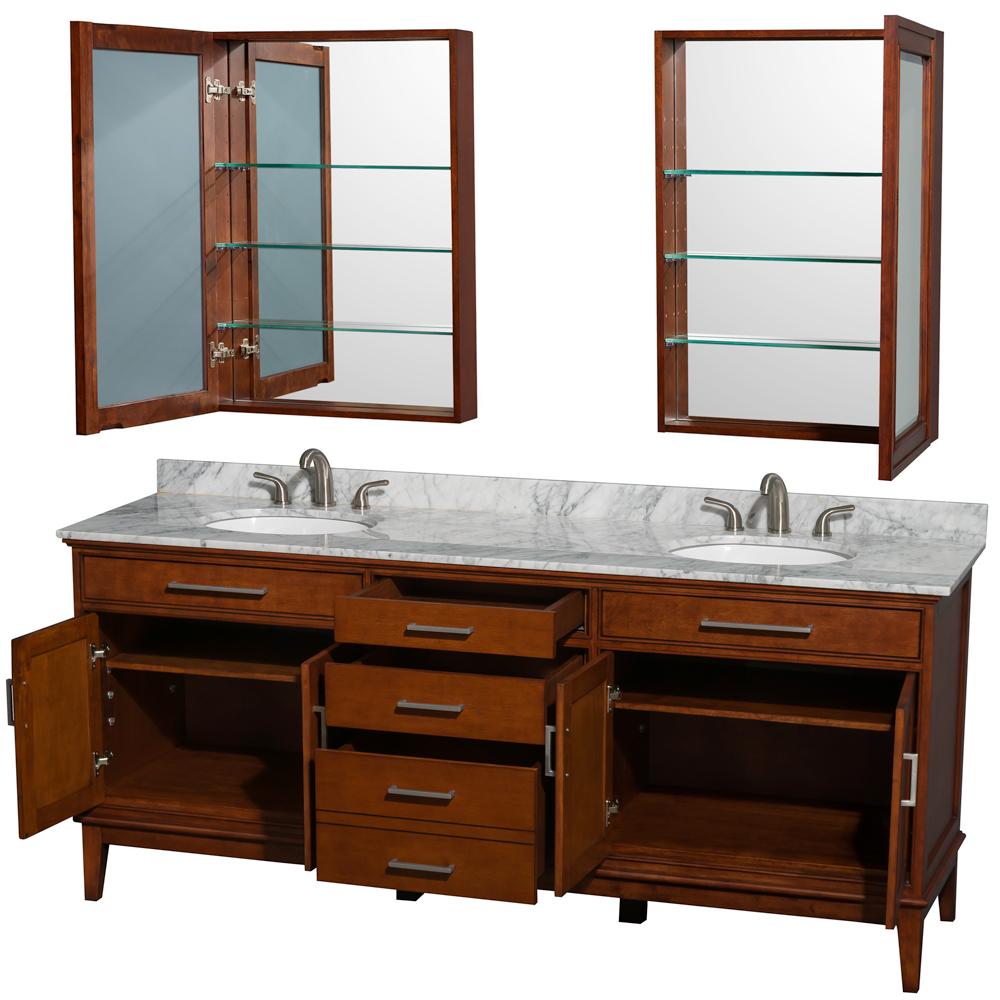 Wyndham Collection WCV161680DCLCMUNRMED Hatton 80 Inch Double Bathroom Vanity in Light Chestnut, White Carrara Marble Countertop, Undermount Oval Sinks, and Medicine Cabinets