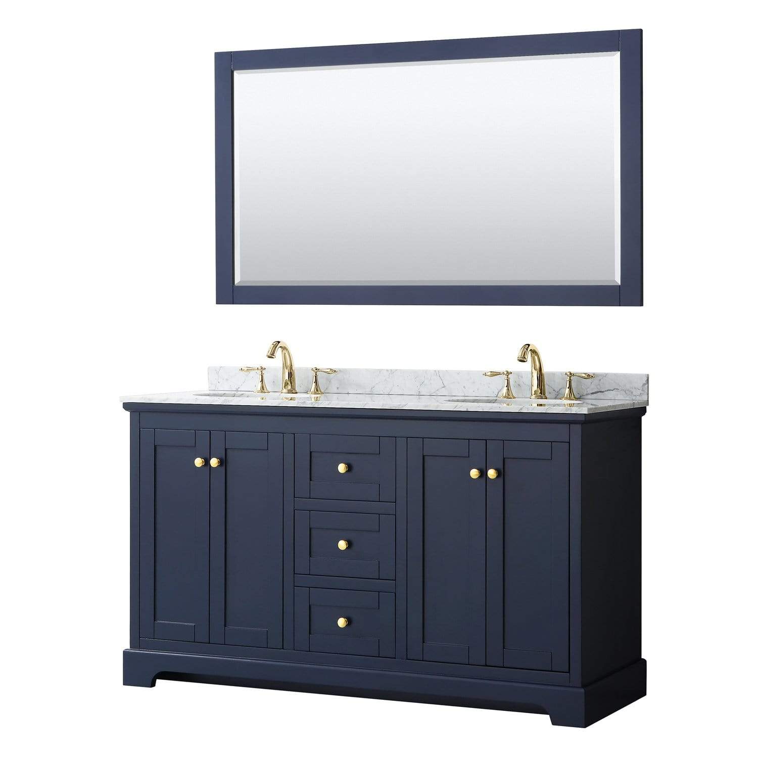 Wyndham Collection WCV232360DBLCMUNOM58 Avery 60 Inch Double Bathroom Vanity in Dark Blue, White Carrara Marble Countertop, Undermount Oval Sinks, and 58 Inch Mirror