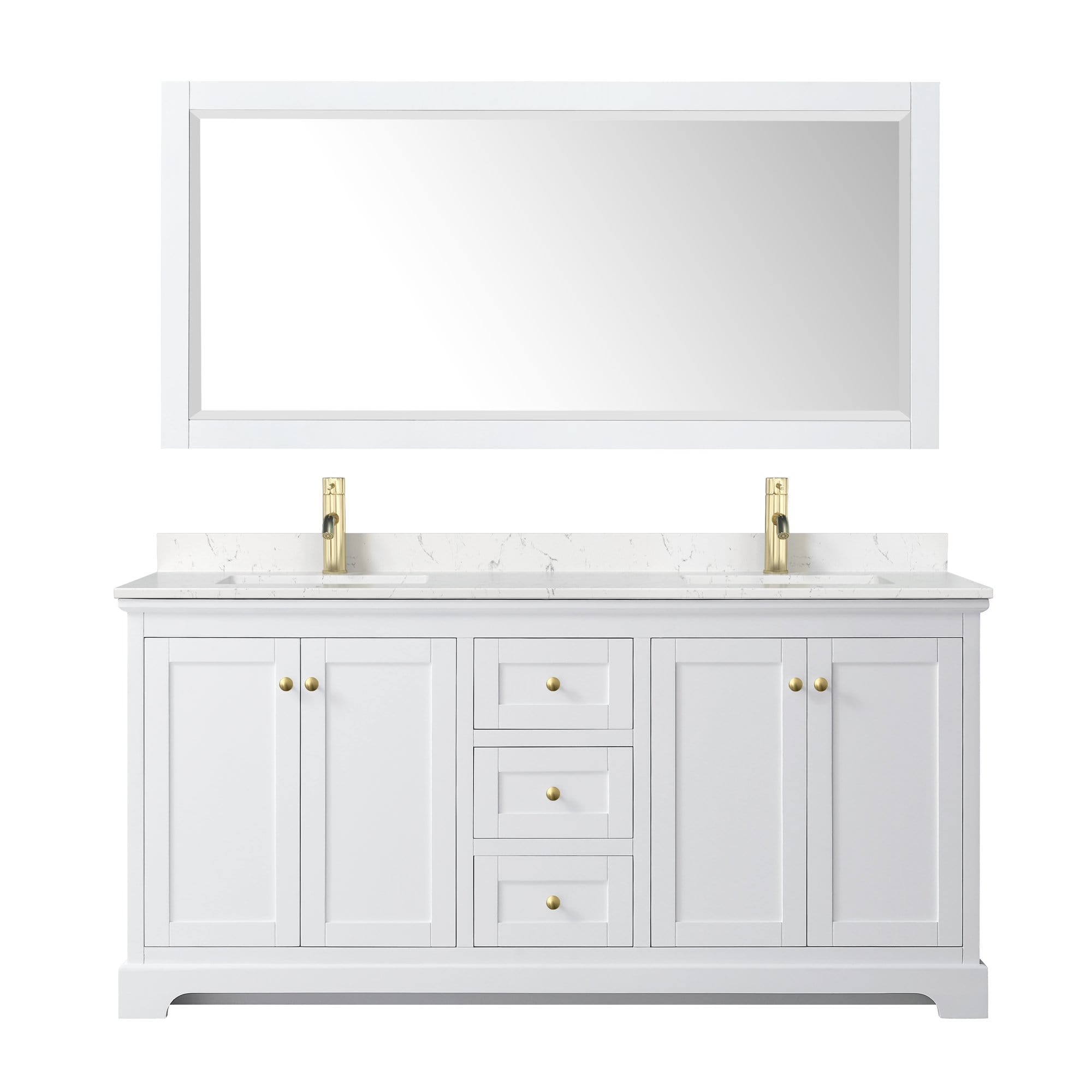 Wyndham Collection WCV232372DWGC2UNSM70 Avery 72 Inch Double Bathroom Vanity in White, Light-Vein Carrara Cultured Marble Countertop, Undermount Square Sinks, 70 Inch Mirror, Brushed Gold Trim Bridging the gap between American Contemporary and European Classic, the Avery vanities are a welcome addition to any bathroom. Beautiful, practical, and designed for a lifetime of service, the Avery series by Wyndham Collection will add that touch of perfection to your bathroom remodel. The series is offered in white with polished chrome or brushed gold accents, contemporary gray with polished chrome accents, or a stunning dark blue with brushed gold accents. Truly a centerpiece worthy of any home. Features: - 12-stage wood preparation, sanding, painting, and finishing process