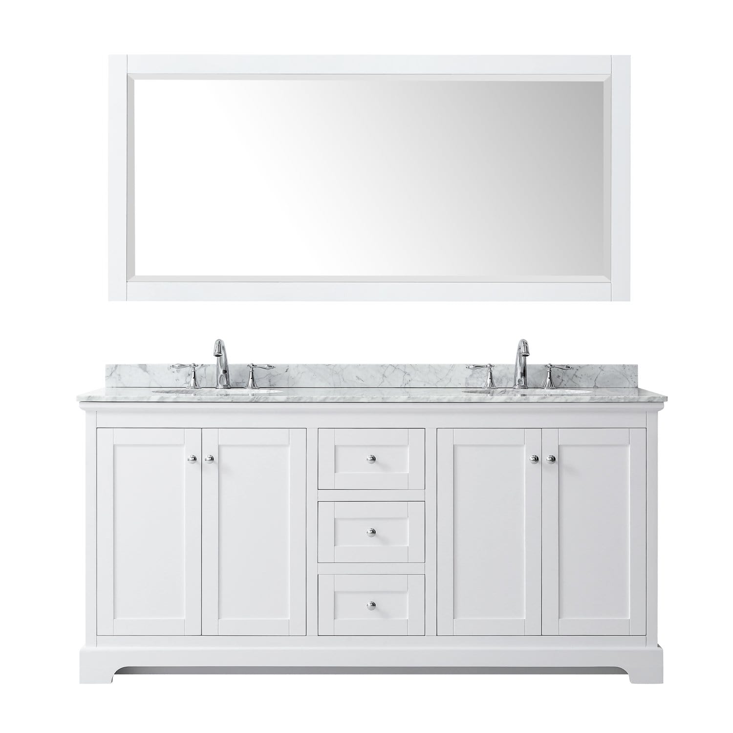 Wyndham Collection WCV232372DWHCMUNOM70 Avery 72 Inch Double Bathroom Vanity in White, White Carrara Marble Countertop, Undermount Oval Sinks, and 70 Inch Mirror
