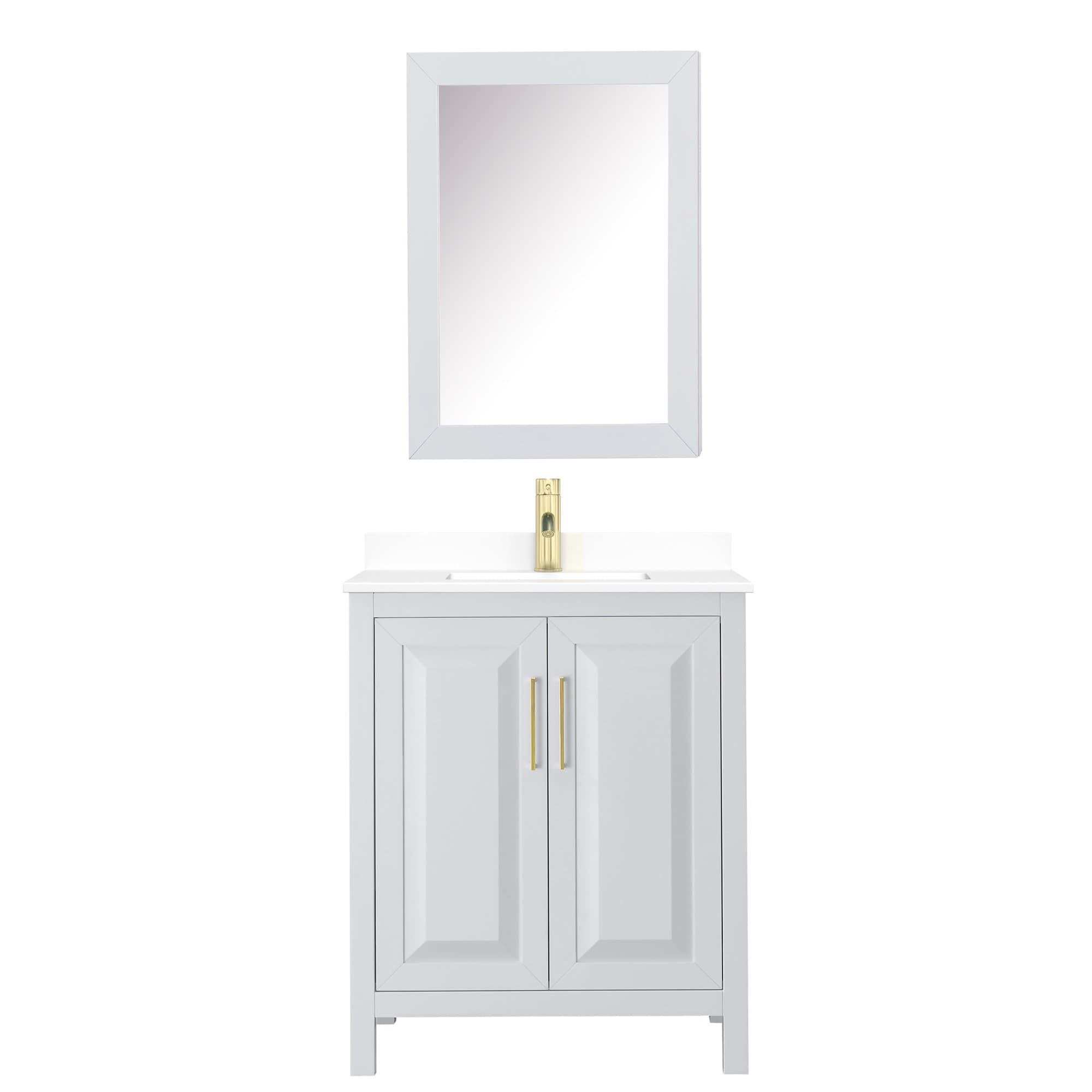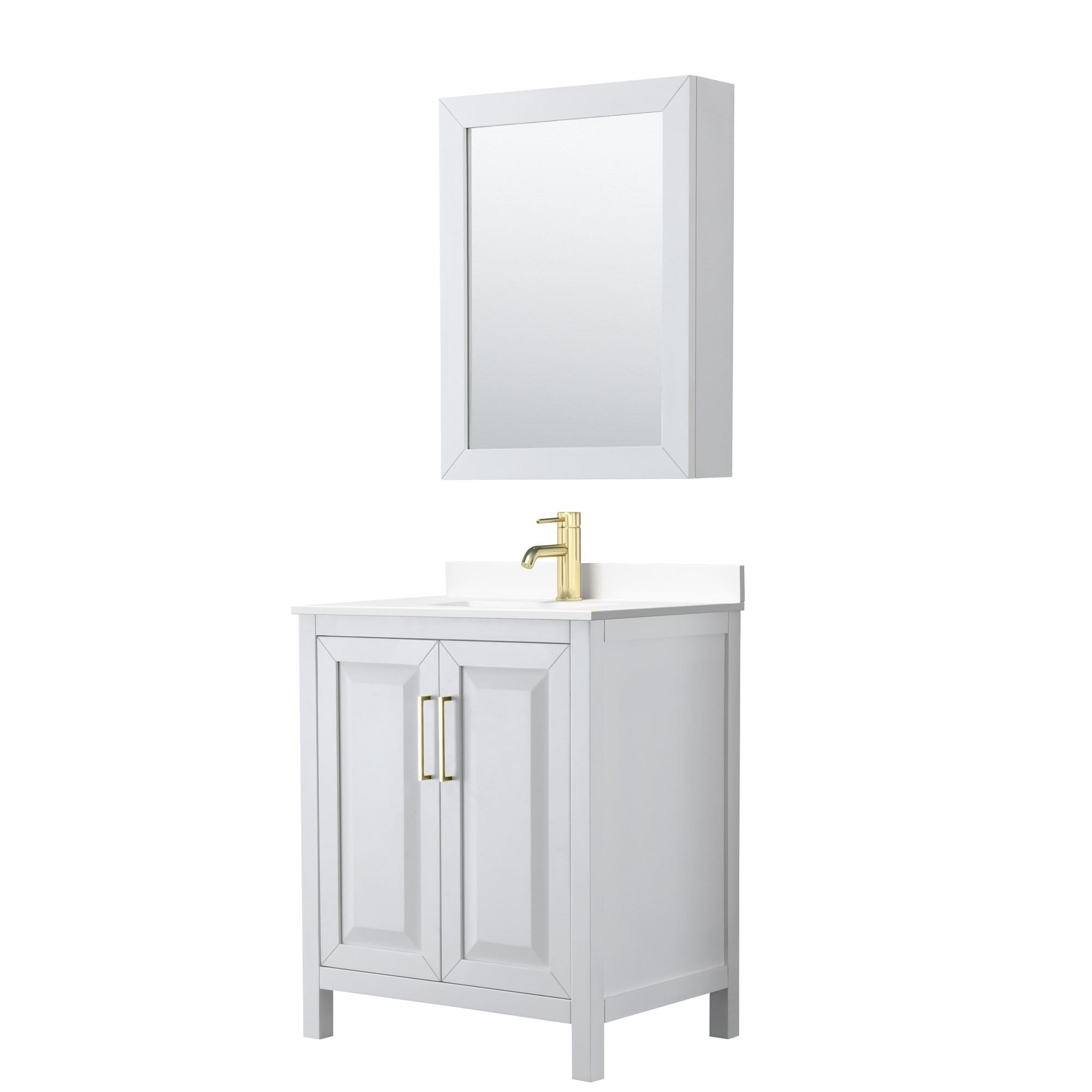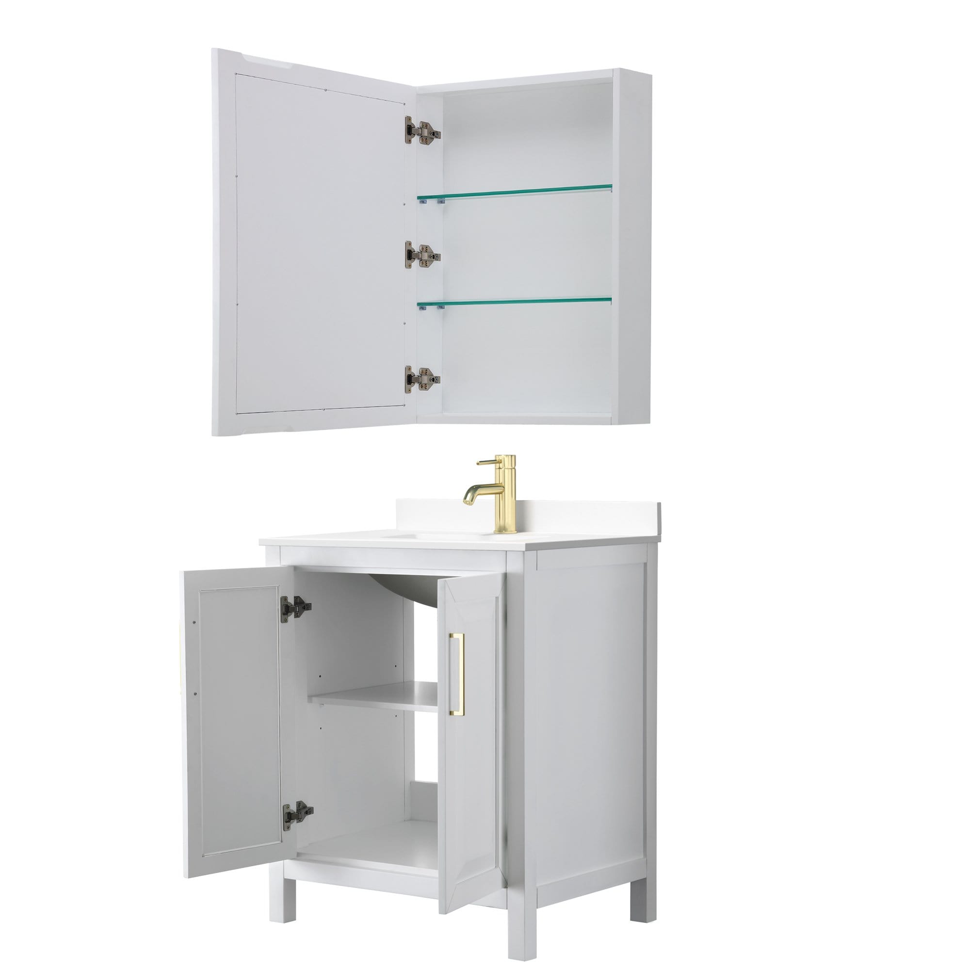 Wyndham Collection WCV252530SWGWCUNSMED Daria 30 Inch Single Bathroom Vanity in White, White Cultured Marble Countertop, Undermount Square Sink, Medicine Cabinet, Brushed Gold Trim The beautiful Daria collection vanities stand out in any bathroom with strong, clean lines and elegant raised panels. There’s plenty of cabinet space, the doors are soft-close construction, and chrome or gold finish detailing completes the look. Daria vanities deftly combine the function of today with a nod to the elegance of the past. It's the new modern – classic styling with a contemporary twist. Features: - 12-stage wood preparation, sanding, painting, and finishing process