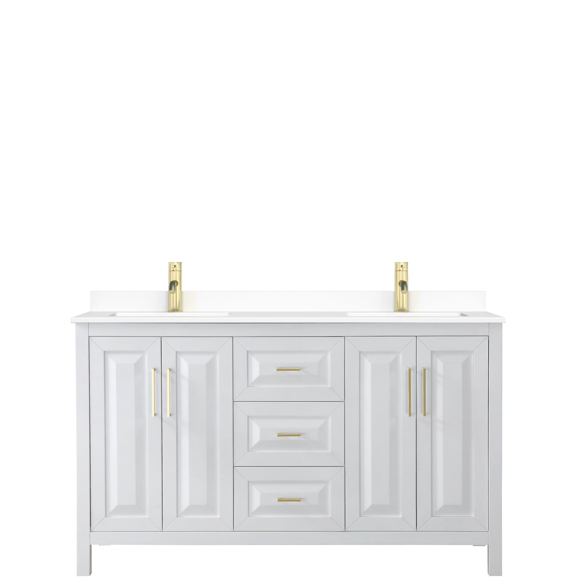 Wyndham Collection WCV252560DWGWCUNSMXX Daria 60 Inch Double Bathroom Vanity in White, White Cultured Marble Countertop, Undermount Square Sinks, Brushed Gold Trim The beautiful Daria collection vanities stand out in any bathroom with strong, clean lines and elegant raised panels. There’s plenty of cabinet space, the doors are soft-close construction, and chrome or gold finish detailing completes the look. Daria vanities deftly combine the function of today with a nod to the elegance of the past. It's the new modern – classic styling with a contemporary twist. Features: - 12-stage wood preparation, sanding, painting, and finishing process