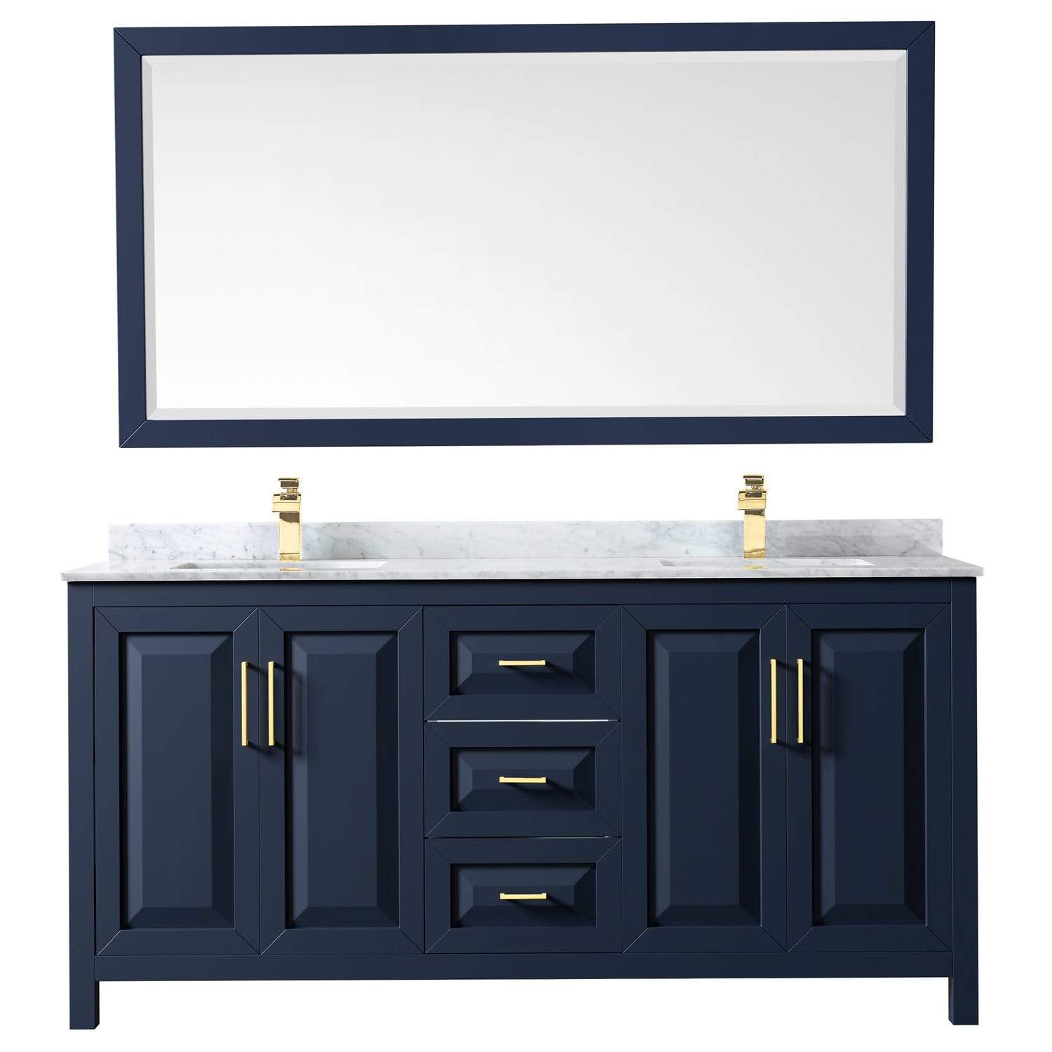 Wyndham Collection WCV252572DBLCMUNSM70 Daria 72 Inch Double Bathroom Vanity in Dark Blue, White Carrara Marble Countertop, Undermount Square Sinks, 70 Inch Mirror