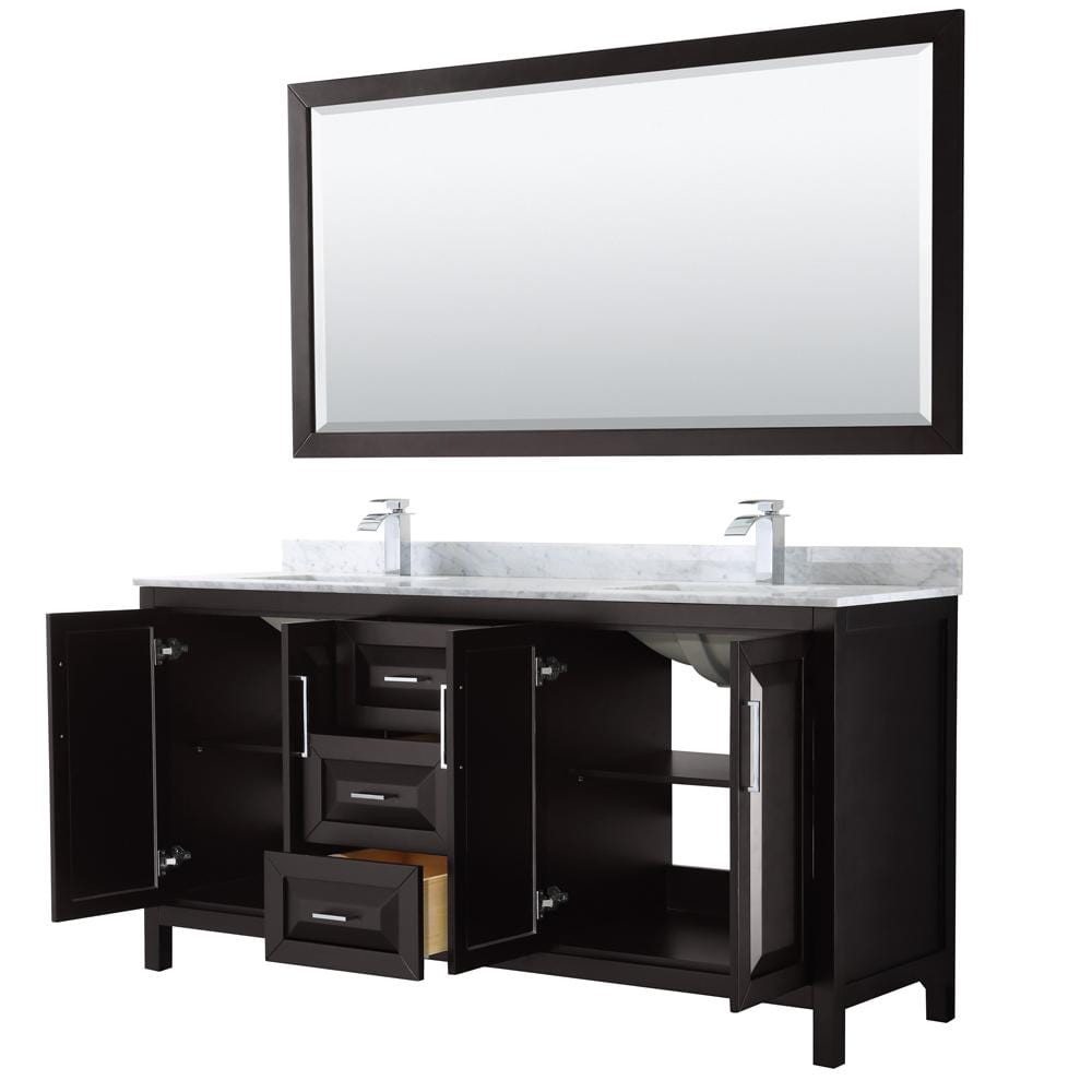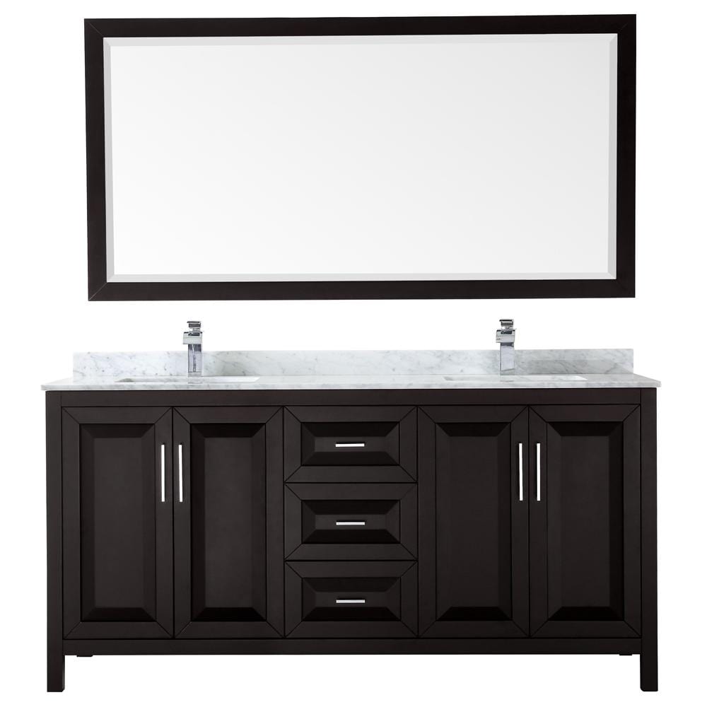 Wyndham Collection WCV252572DDECMUNSM70 Daria 72 Inch Double Bathroom Vanity in Dark Espresso, White Carrara Marble Countertop, Undermount Square Sinks, and 70 Inch Mirror