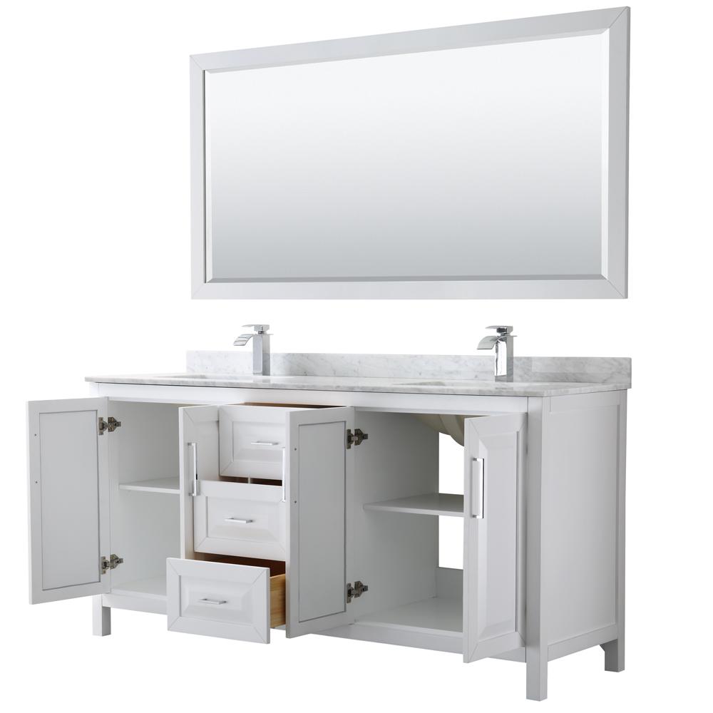 Wyndham Collection WCV252572DWHCMUNSM70 Daria 72 Inch Double Bathroom Vanity in White, White Carrara Marble Countertop, Undermount Square Sinks, and 70 Inch Mirror