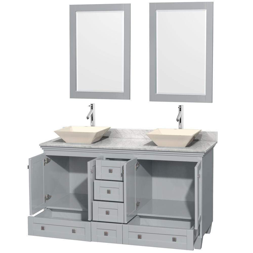 Wyndham Collection WCV800060DOYCMD2BM24 Acclaim 60 Inch Double Bathroom Vanity in Oyster Gray, White Carrara Marble Countertop, Pyra Bone Porcelain Sinks, and 24 Inch Mirrors